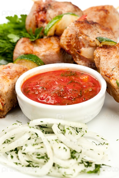 Шашлык из свинины с соусом и овощами, крупный план