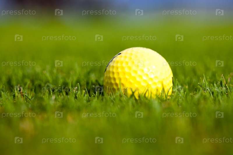 Желтый мяч для гольфа на зеленой траве