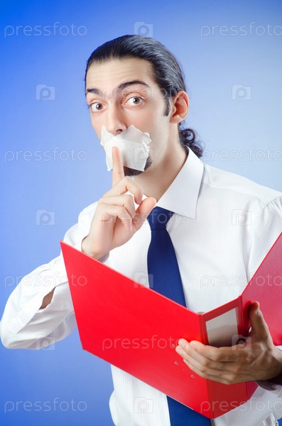Бизнесмен с заклеенным ртом и папкой в руке