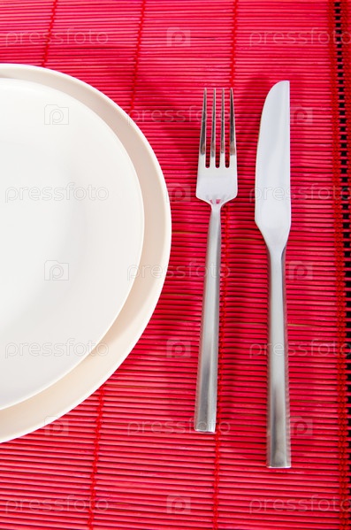 Тарелка, вилка и нож на красной салфетке