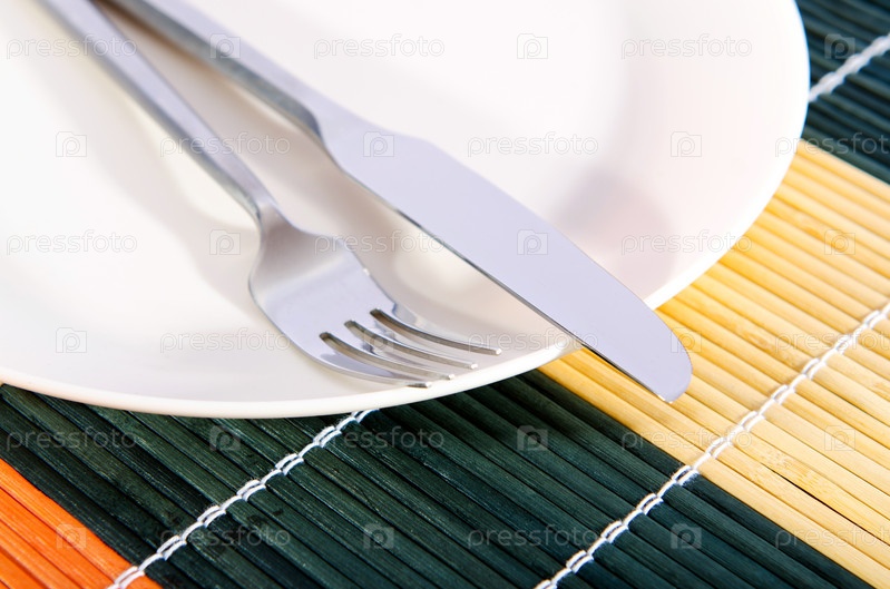 Тарелка, вилка и нож на бамбуковой салфетке