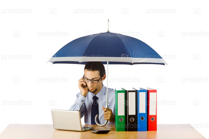 Бизнесмен под зонтиком в офисе