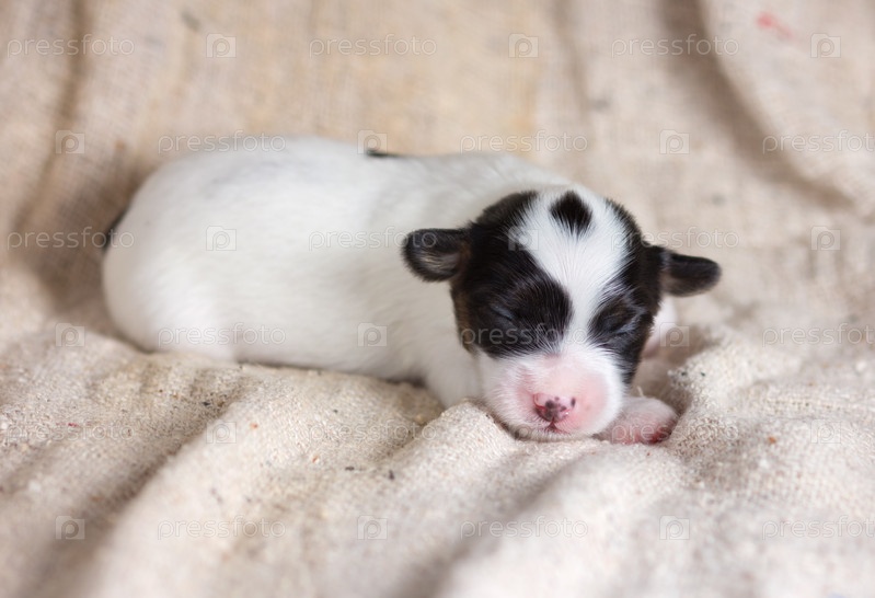 Маленький щенок папильона лежит на мешковине
