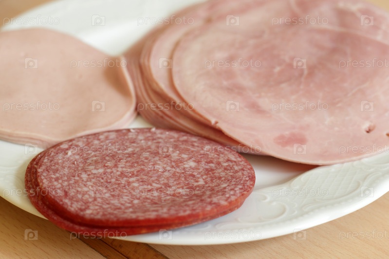 Нарезанная ветчина и колбаса на тарелке