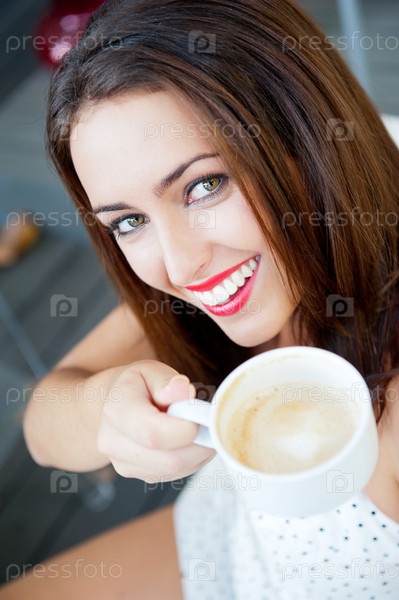 Портрет красивой молодой женщины с чашкой кофе