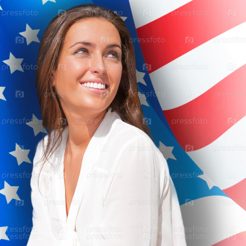 Портрет красивой молодой женщины на фоне американского флага