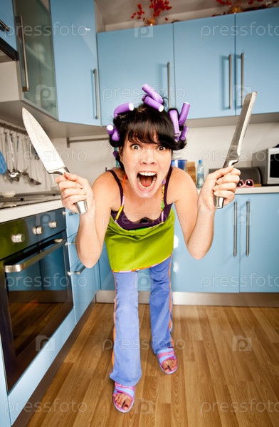Агрессивная домохозяка с ножами в руках
