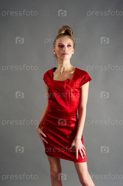 Молодая девушка-фотомодель в красном платье на сером фоне