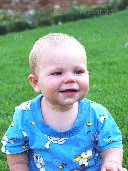 Счастливый малыш на зелёном газоне