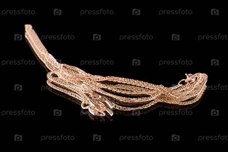 Золотая цепочка с кулоном на черном фоне