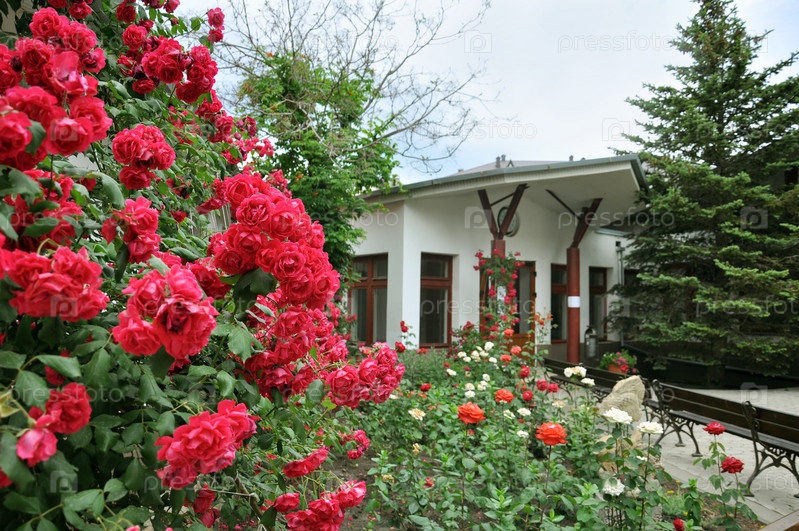 Красивые красные розы у дома, ландшафтный дизайн