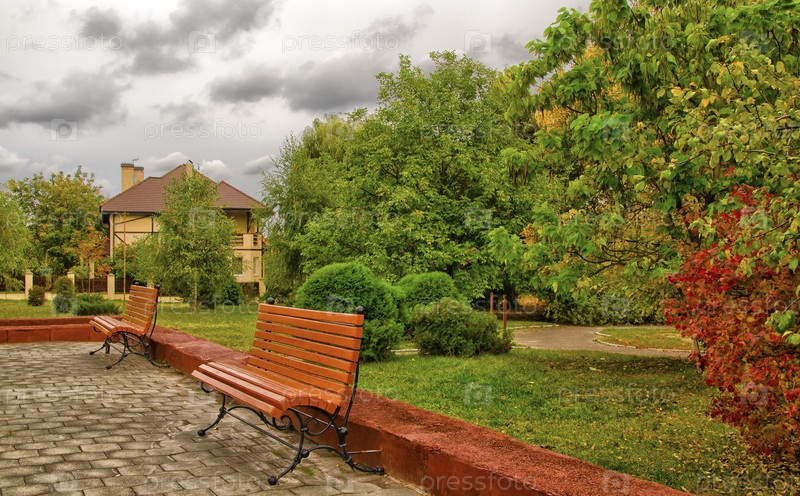 Лавочки в парке на фоне осенних деревьев
