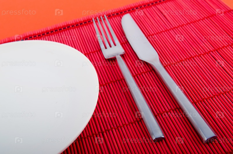 Столовые приборы на красной бамбуковой салфетке