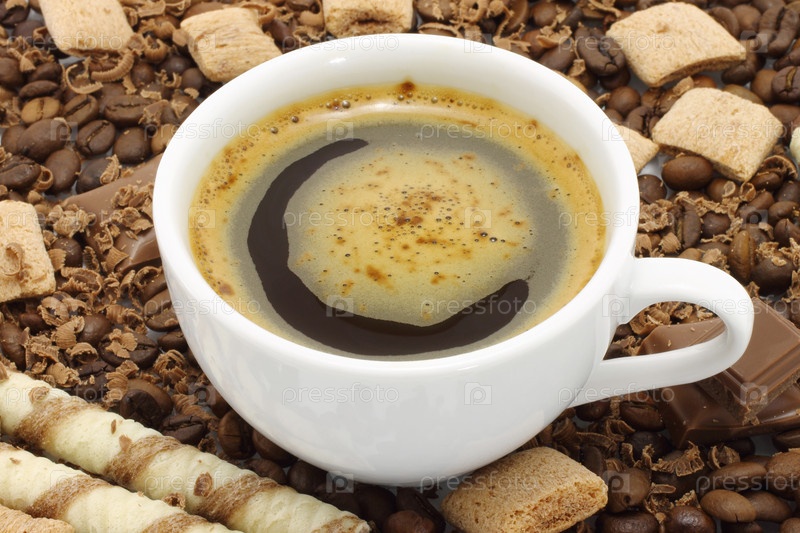 Чашка кофе на фоне сладостей и кофейных зерен