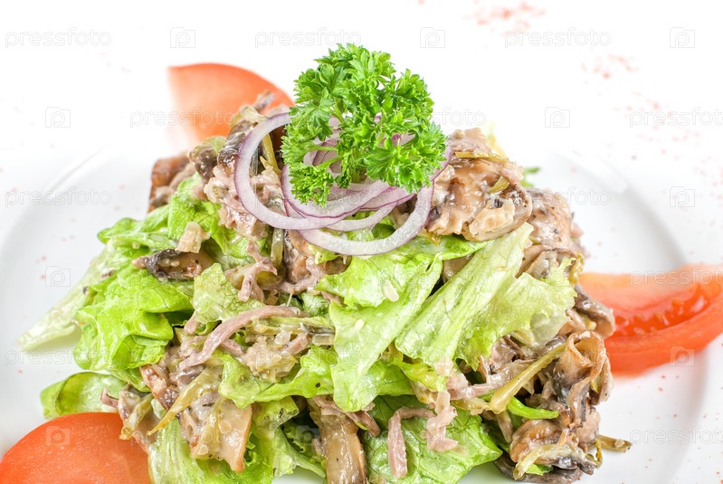 Салат с грибами на белой тарелке