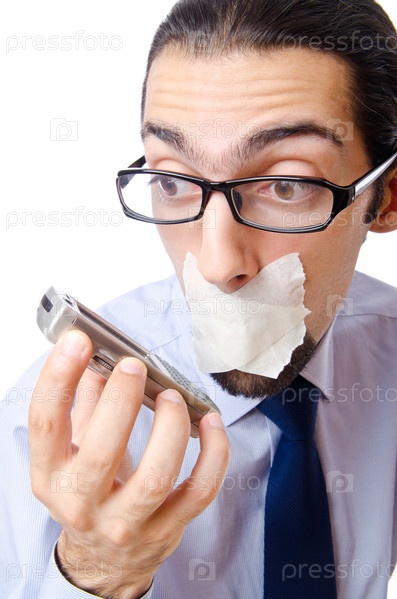 Мужчина с телефоном и заклеенным ртом