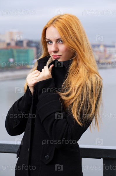 Молодая красивая рыжеволосая женщина на городском фоне