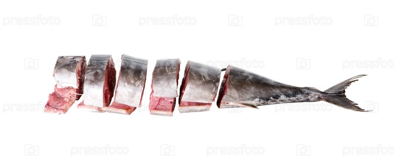 Разрезанная на куски тушка тунца на белом фоне
