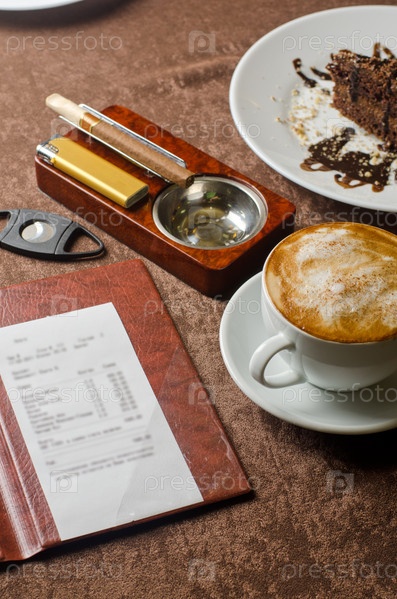 Кофе, шоколадный десерт, пепельница и счет на столике в кафе