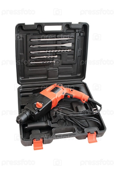 Перфоратор с комплектом насадок в открытом ящике, белый фон