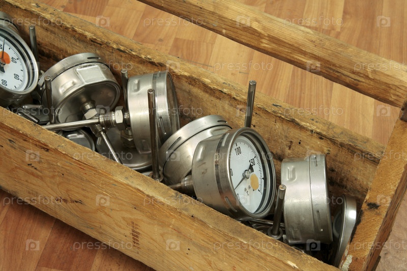 Деревянный лоток с промышленными термометрами на полу