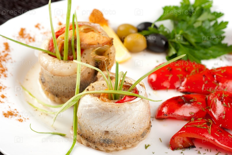 Филе судака, фаршированное форелью с запеченным перцем, помидорами и луком-пореем