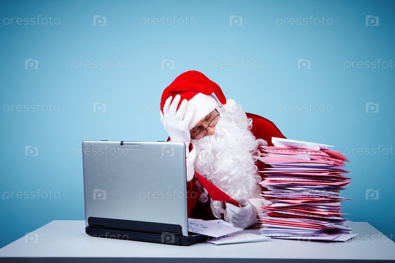 Санта Клаус с письмами и ноутбуком