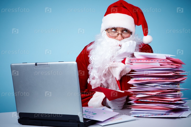 Задумчивый Санта Клаус с письмами и ноутбуком