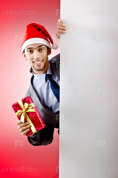 Бизнесмен в колпаке Санта-Клауса и с подарком в руках