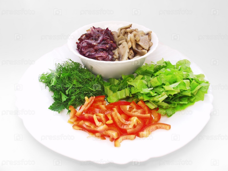 Ингредиенты для салата: грибы, лук, перец и другие овощи на белом фоне