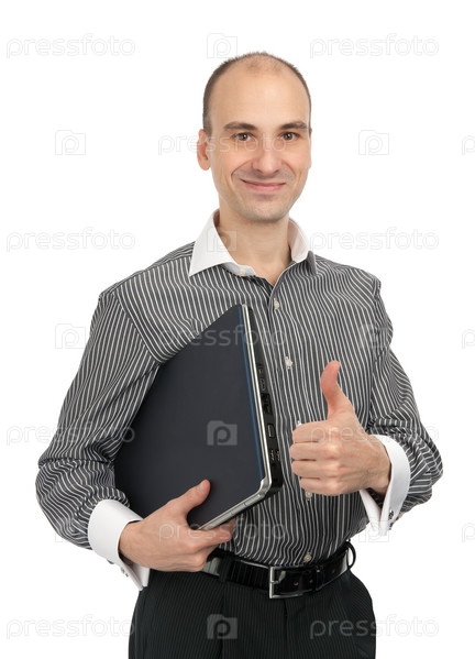 Парень держит ноутбук и показывает свой большой палец