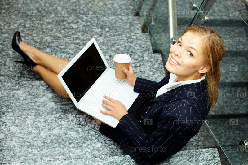 Портрет красивой молодой бизнес-леди с ноутбуком и кофе