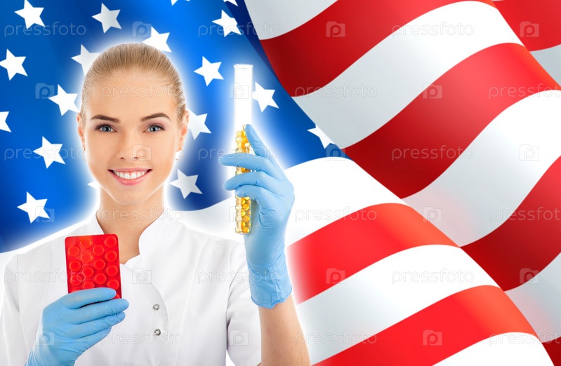 Женщина-врач на фоне американского флага