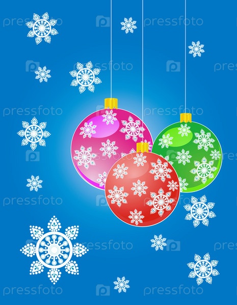 Елочные шары и снежинки, иллюстрация на голубом фоне