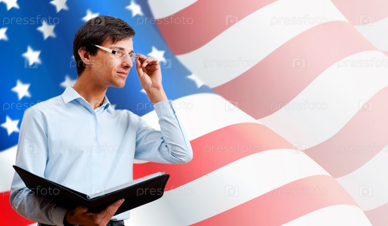 Мужчина с папкой документов на фоне американского флага
