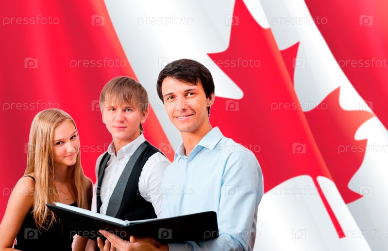 Молодые студенты с учителем на фоне канадского флага