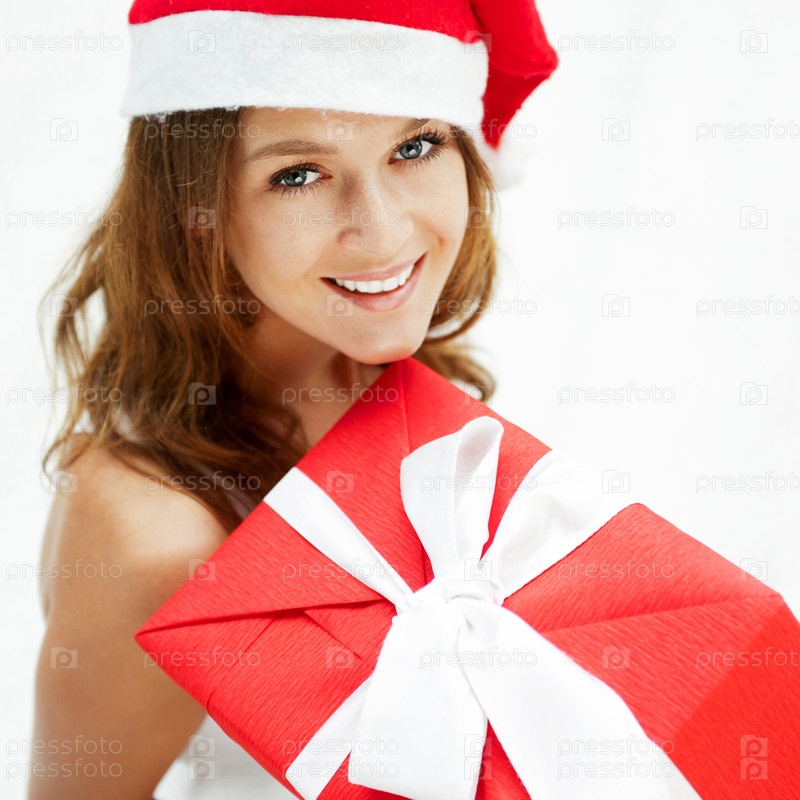 Портрет красивой молодой женщины в новогодней шапке с подарком