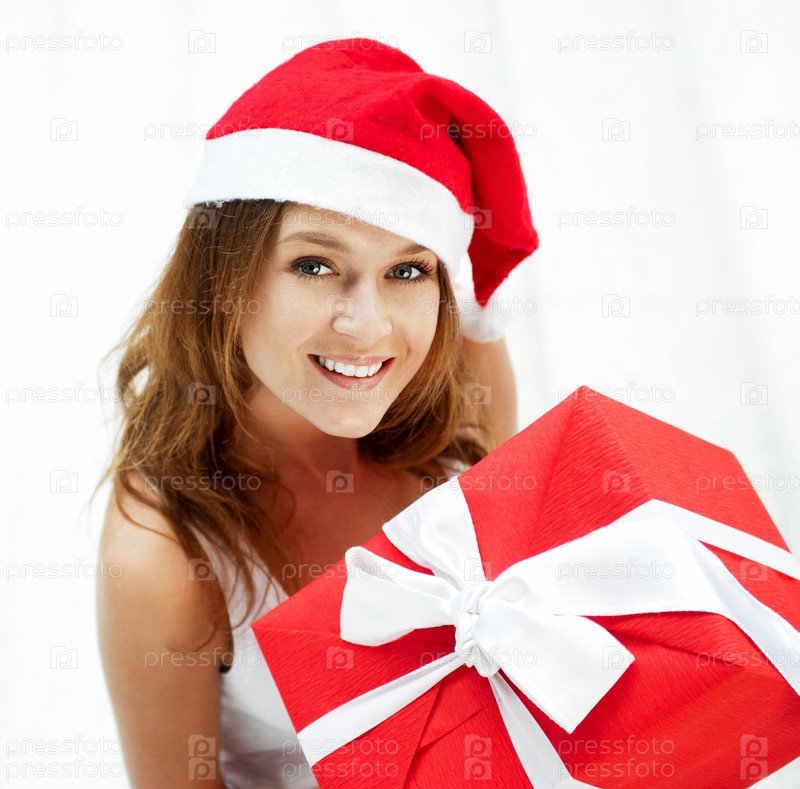 Портрет красивой молодой женщины в новогодней шапке с подарком