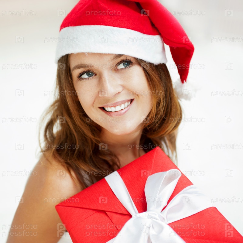 Портрет красивой молодой женщины в новогодней шапке с подарком