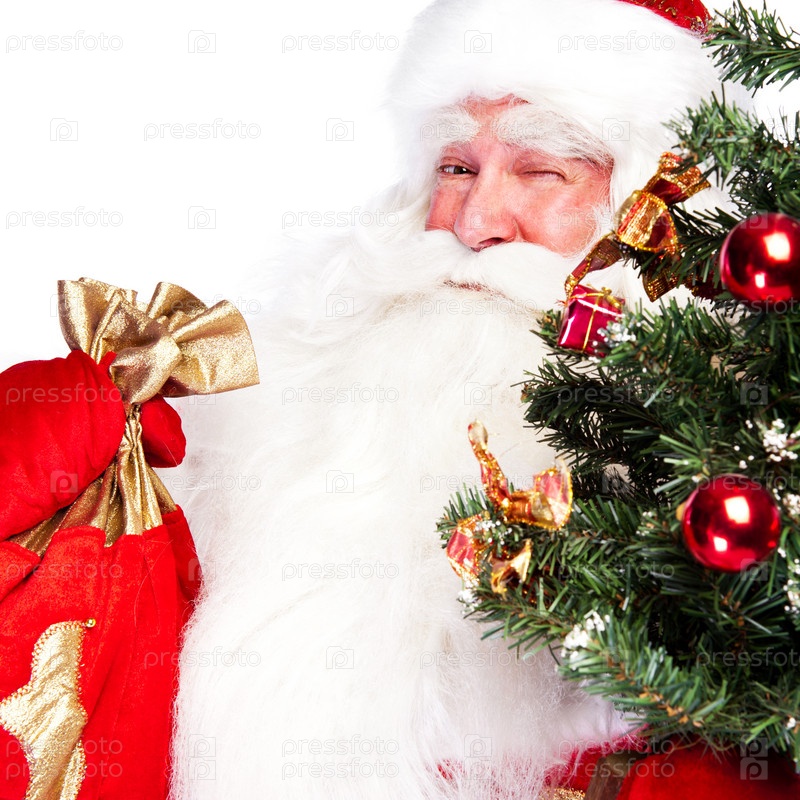 Дед Мороз с елкой и мешком подарков на белом фоне