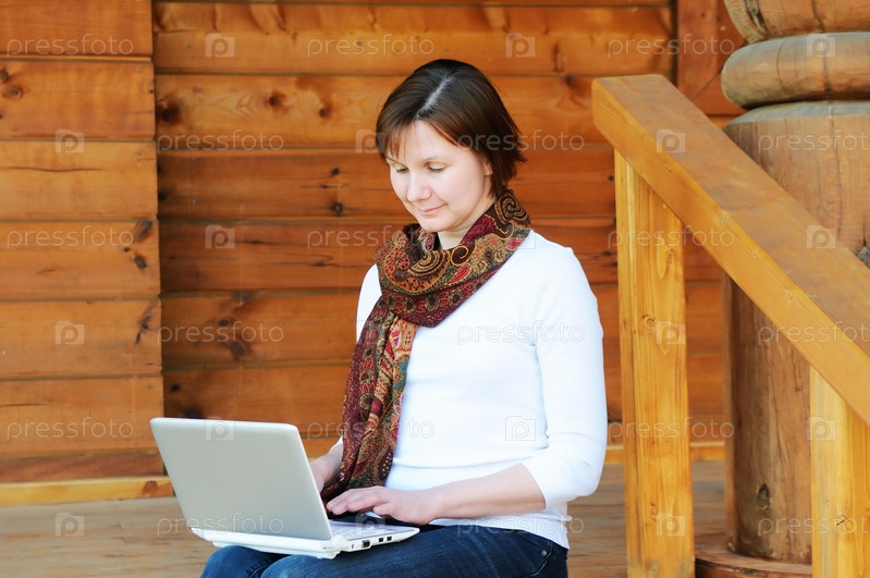 Женщина работает на компьютере, сидя на крыльце загородного дома