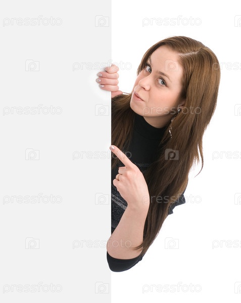 Портрет красивой женщины, держащей в руках пустой рекламный щит