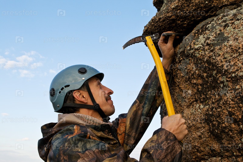 Скалолаз с ледорубом в руках на отвесной скале