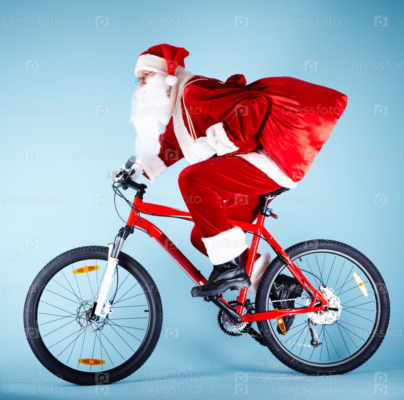 Санта с подарками на велосипеде на голубом фоне
