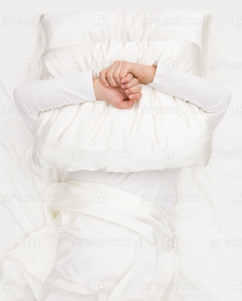Изображение мужских рук, обнимающих подушку и закрывающих ею лицо