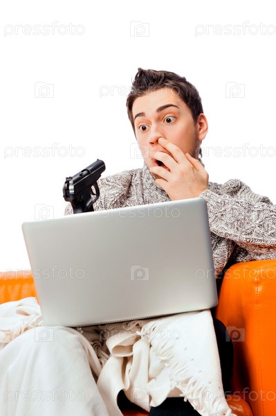 Портрет симпатичного молодого человека, играющего в игры на ноутбуке