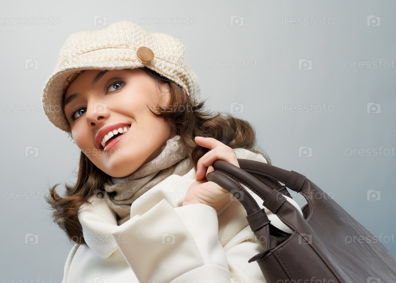 Красивая брюнетка в верхней одежде с сумкой на светлом фоне