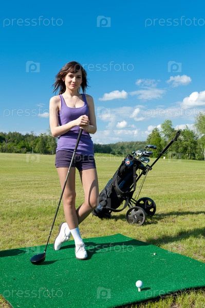 Молодая симпатичная девушка во время игры в гольф