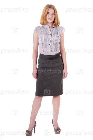 Портрет молодой женщины в блузке и юбке на белом фоне