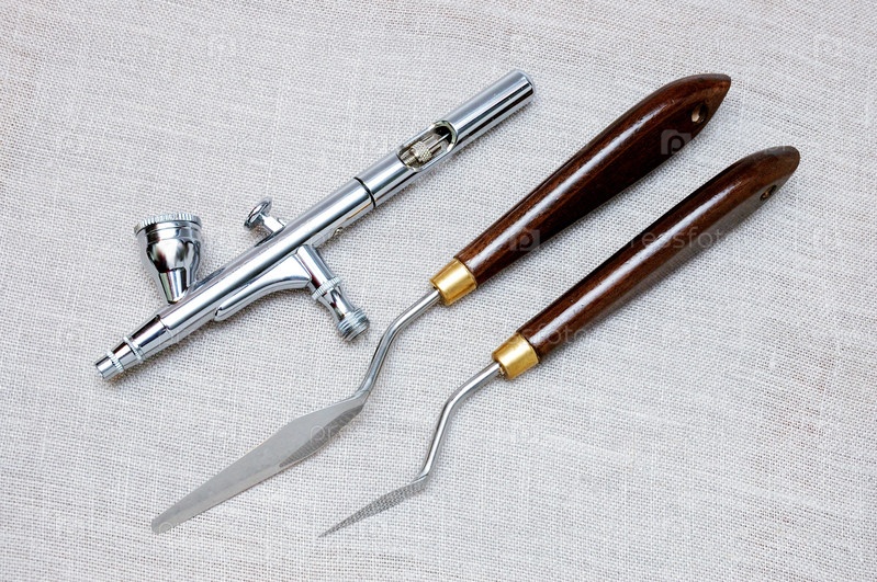 Аэрограф и мастихины на сером холсте